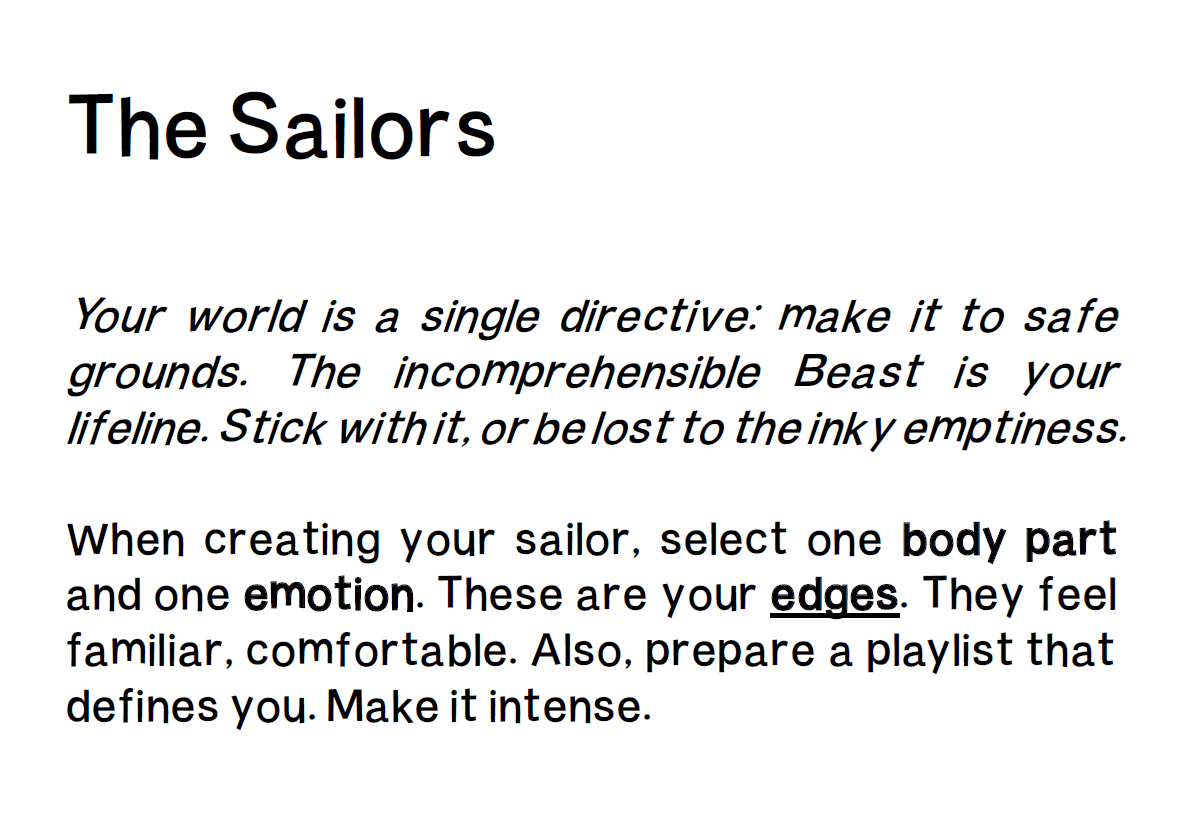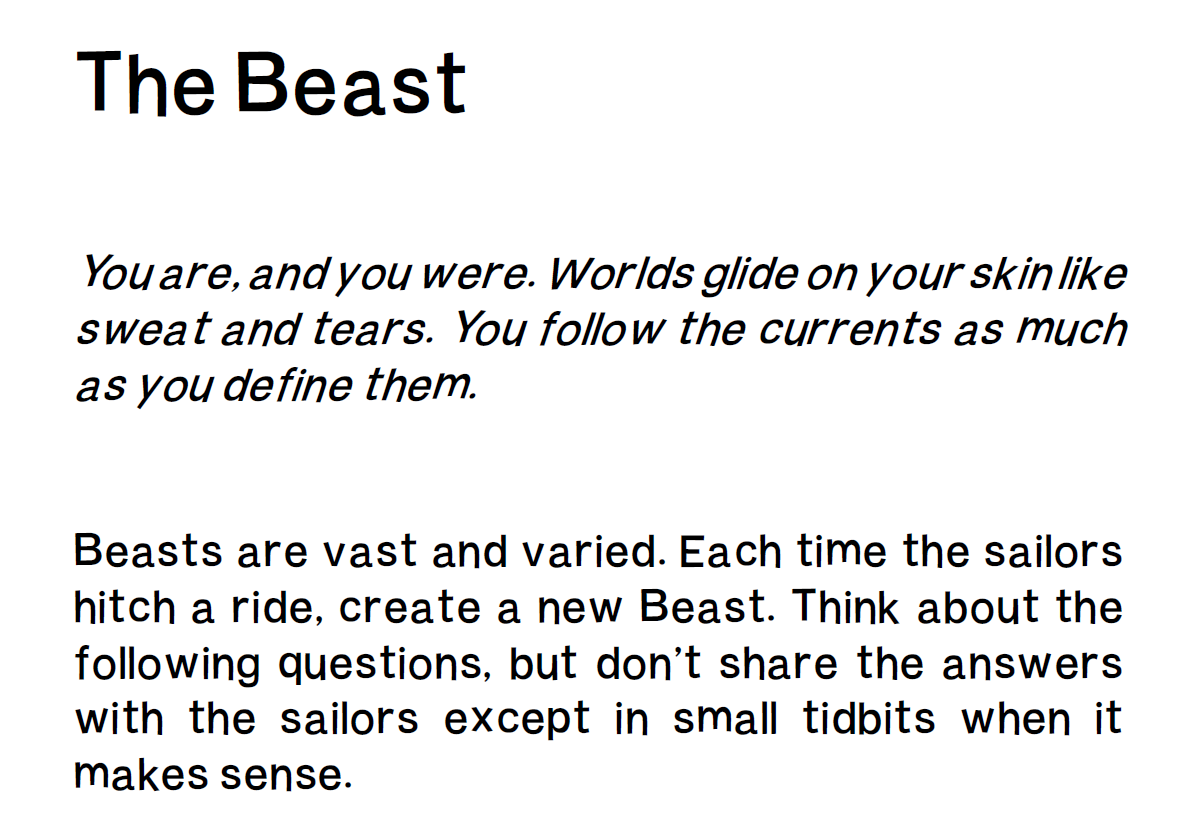 Nothing is more terrifying than the black river-streams that connect reality, but you know that people are helpless when divided. So you ride metal rafts on the back of titanic Beasts, connecting city-world to city-world, trading salvage and bringing news of sons to mothers.